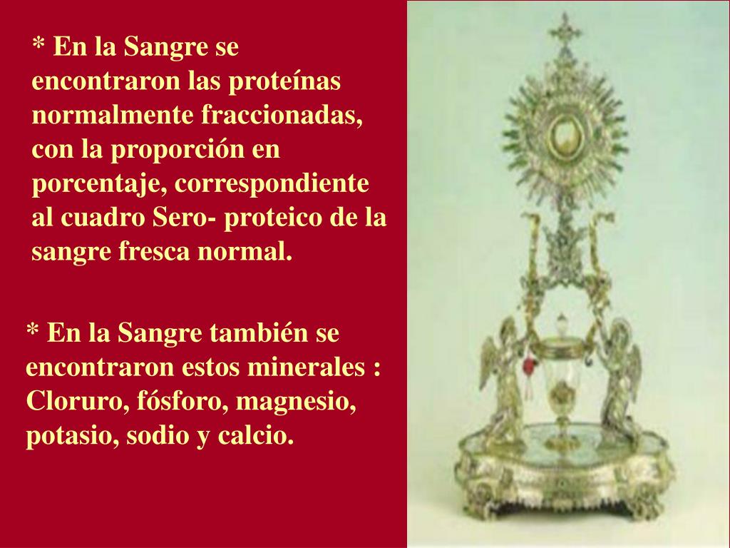 * En la Sangre se encontraron las proteínas normalmente fraccionadas, con la proporción en porcentaje, correspondiente al cuadro Sero- proteico de la sangre fresca normal. * En la Sangre también se encontraron estos minerales : Cloruro, fósforo, magnesio, potasio, sodio y calcio.