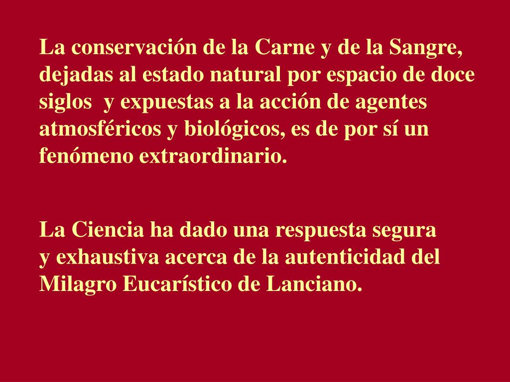 La conservación de la Carne y de la Sangre, dejadas al estado natural por espacio de doce siglos y expuestas a la acción de agentes atmosféricos y biológicos, es de por sí un fenómeno extraordinario. La Ciencia ha dado una respuesta segura y exhaustiva acerca de la autenticidad del Milagro Eucarístico de Lanciano.