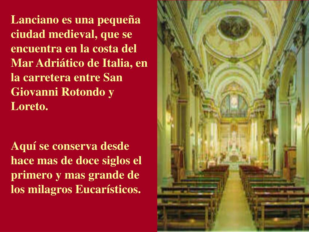 Lanciano es una pequeña ciudad medieval, que se encuentra en la costa del Mar Adriático de Italia, en la carretera entre San Giovanni Rotondo y Loreto. Aquí se conserva desde hace mas de doce siglos el primero y mas grande de los milagros Eucarísticos.
