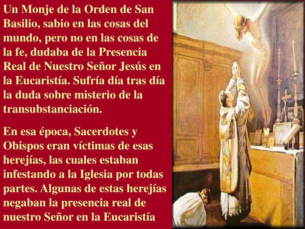 Un Monje de la Orden de San Basilio, sabio en las cosas del mundo, pero no en las cosas de la fe, dudaba de la Presencia Real de Nuestro Señor Jesús en la Eucaristía. Sufría día tras día la duda sobre misterio de la transubstanciación. En esa época, Sacerdotes y Obispos eran víctimas de esas herejías, las cuales estaban infestando a la Iglesia por todas partes. Algunas de estas herejías negaban la presencia real de nuestro Señor en la Eucaristía.