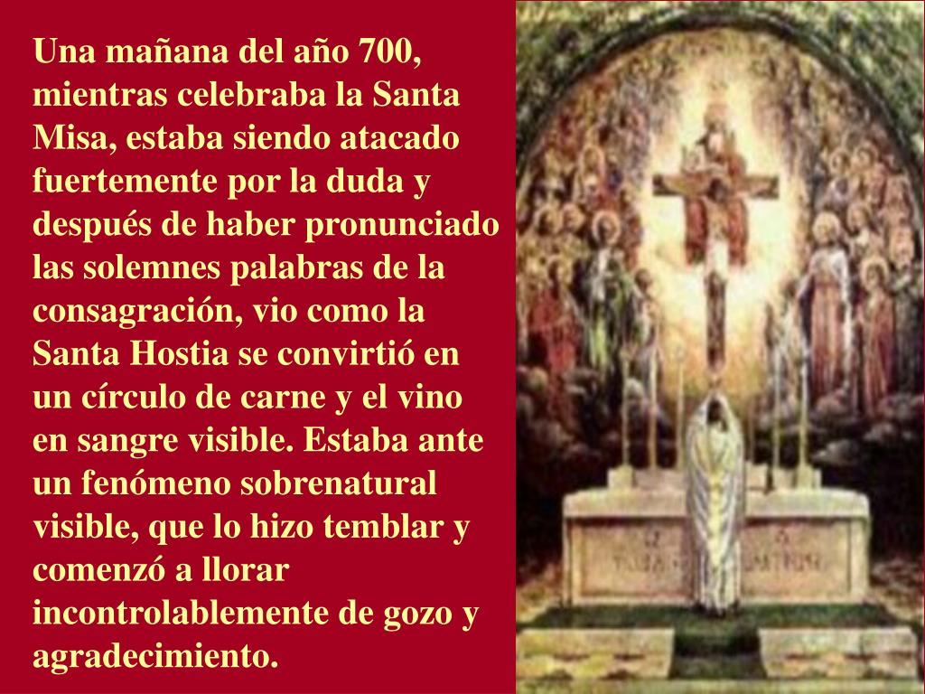 El Milagro Eucarístico de Lanciano. La Eucaristía es el más grande, excelso y santo Sacramento en el que están presentes verdaderamente la Carne, Sangre, Alma y Divinidad de Nuestro Señor Jesucristo.