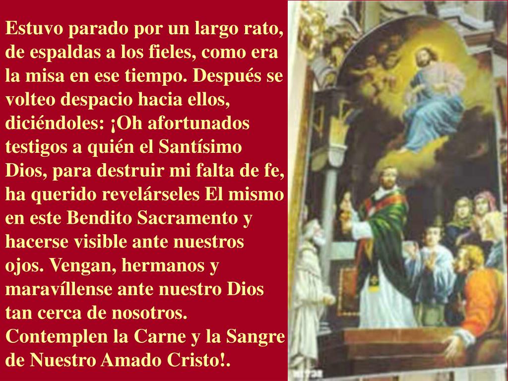 Estuvo parado por un largo rato, de espaldas a los fieles, como era la misa en ese tiempo. Después se volteo despacio hacia ellos, diciéndoles: ¡Oh afortunados testigos a quién el Santísimo Dios, para destruir mi falta de fe, ha querido revelárseles El mismo en este Bendito Sacramento y hacerse visible ante nuestros ojos. Vengan, hermanos y maravíllense ante nuestro Dios tan cerca de nosotros. Contemplen la Carne y la Sangre de Nuestro Amado Cristo!.