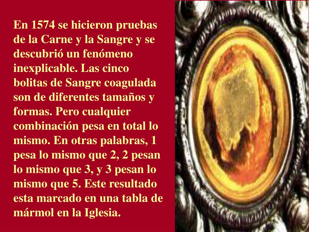 En 1574 se hicieron pruebas de la Carne y la Sangre y se descubrió un fenómeno inexplicable. Las cinco bolitas de Sangre coagulada son de diferentes tamaños y formas. Pero cualquier combinación pesa en total lo mismo. En otras palabras, 1 pesa lo mismo que 2, 2 pesan lo mismo que 3, y 3 pesan lo mismo que 5. Este resultado esta marcado en una tabla de mármol en la Iglesia.