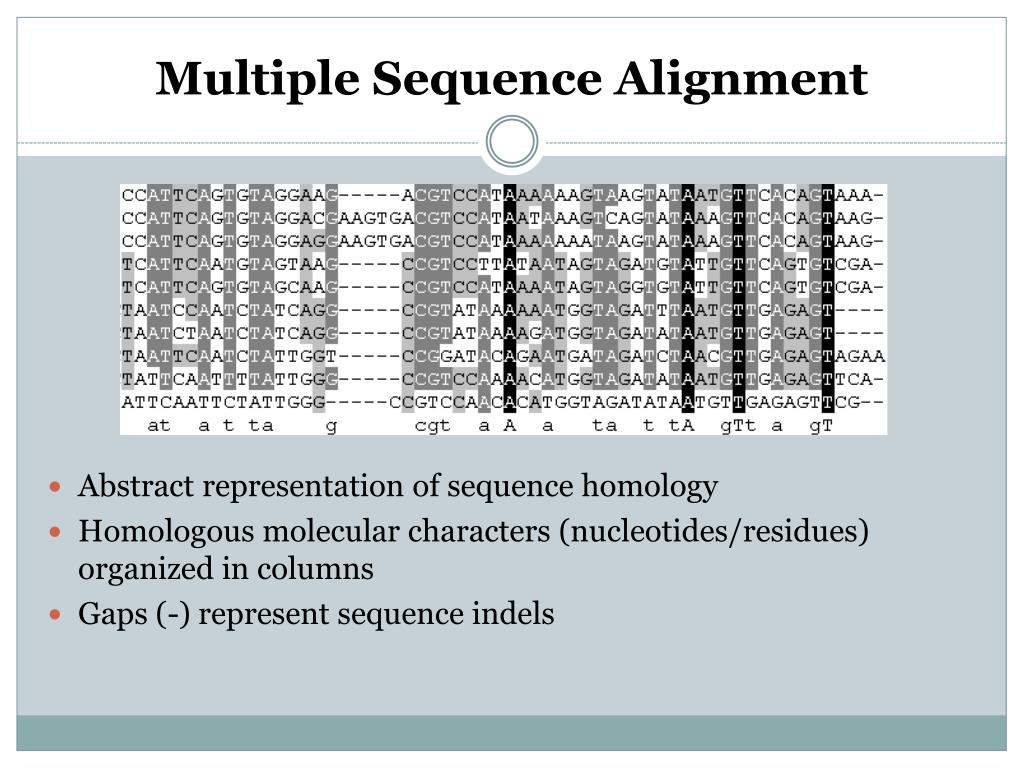 Multiple Sequence Alignment Abstract representation of sequence homology Homologous molecular characters (nucleotides/residues) organized in columns Gaps (-) represent sequence indels