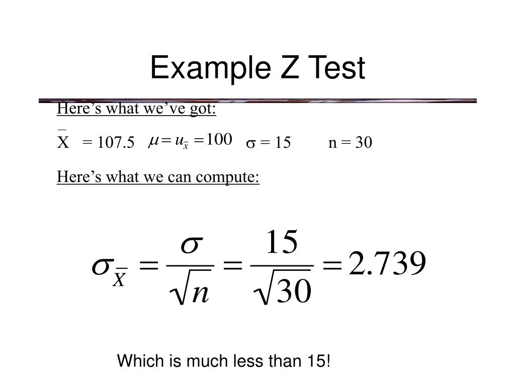 X Example Z Test Here’s what we’ve got: = 107.5 = 15 n = 30 Here’s what we can compute: