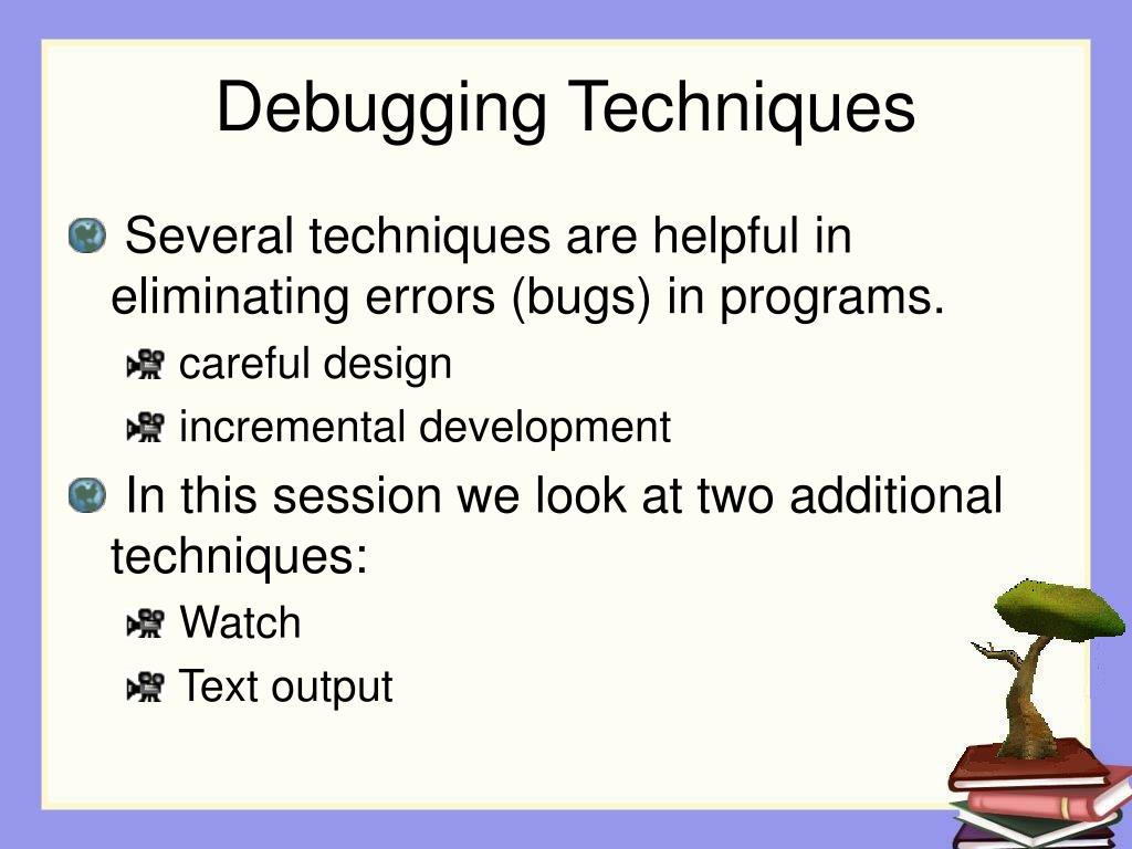 Debugging Techniques • Several techniques are helpful in eliminating errors (bugs) in programs. • careful design • incremental development • In this session we look at two additional techniques: • Watch • Text output