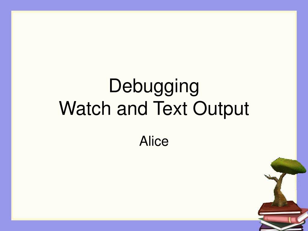 Debugging Watch and Text Output. Alice. Debugging Techniques. Several techniques are helpful in eliminating errors (bugs) in programs. careful design incremental development In this session we look at two additional techniques: Watch Text output. Watch.