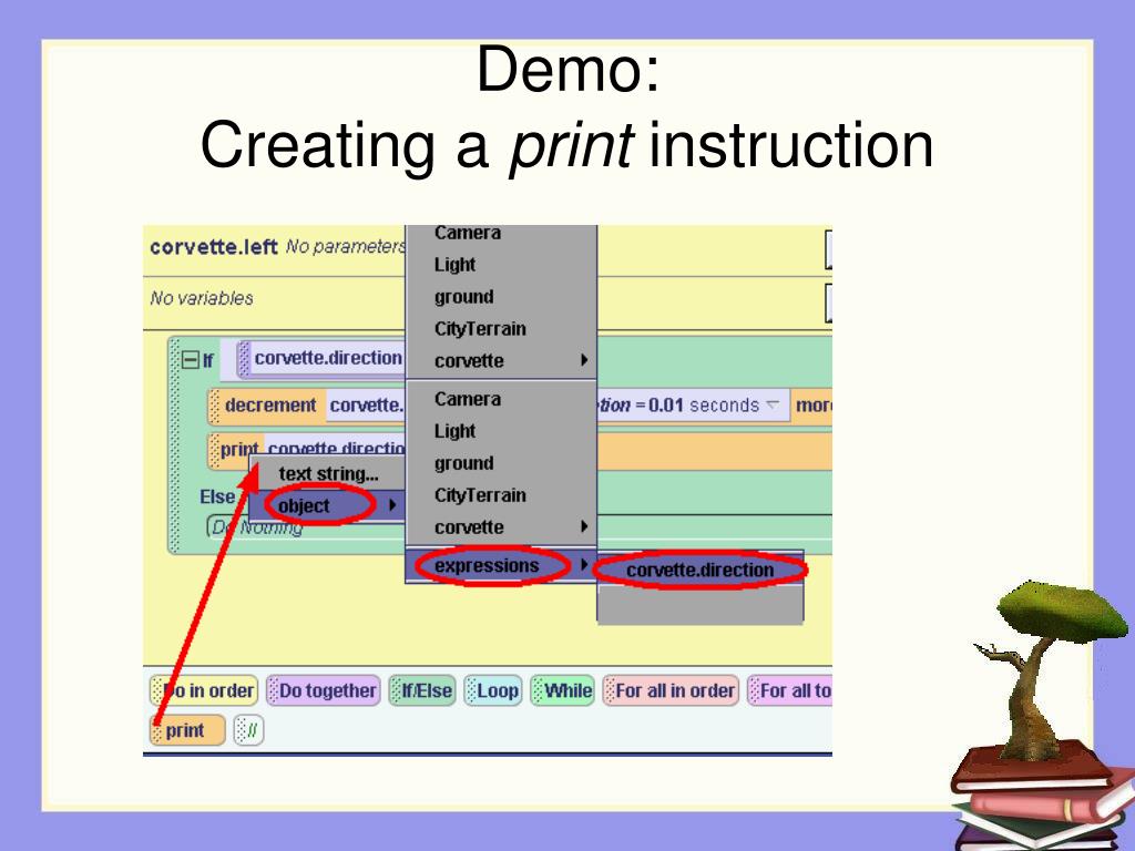 Text Output • Using a print instruction is another way to keep an eye on the value stored in a variable at runtime. • The print instruction causes the animation to be displayed in a split window. • One pane displays the animation • A second pane is a text console where text output is displayed.
