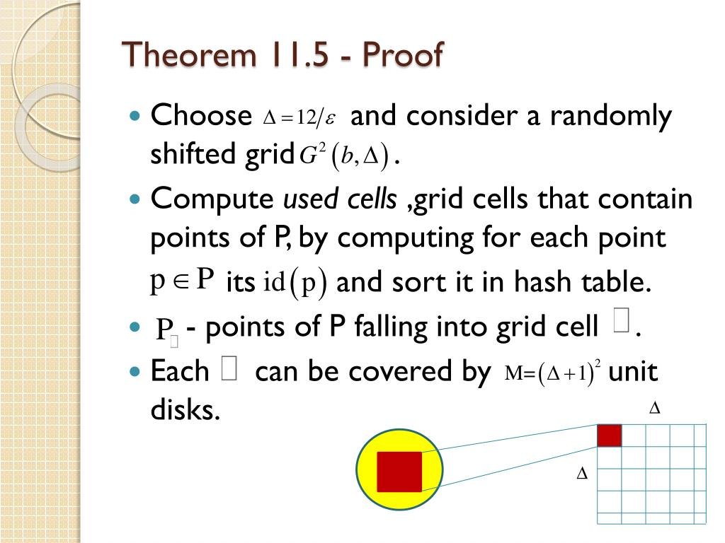 Theorem 11.5 - Proof • Choose and consider a randomly shifted grid . • Compute used cells ,grid cells that contain points of P, by computing for each point its and sort it in hash table. • - points of P falling into grid cell . • Each can be covered by unit disks. ∆ ∆
