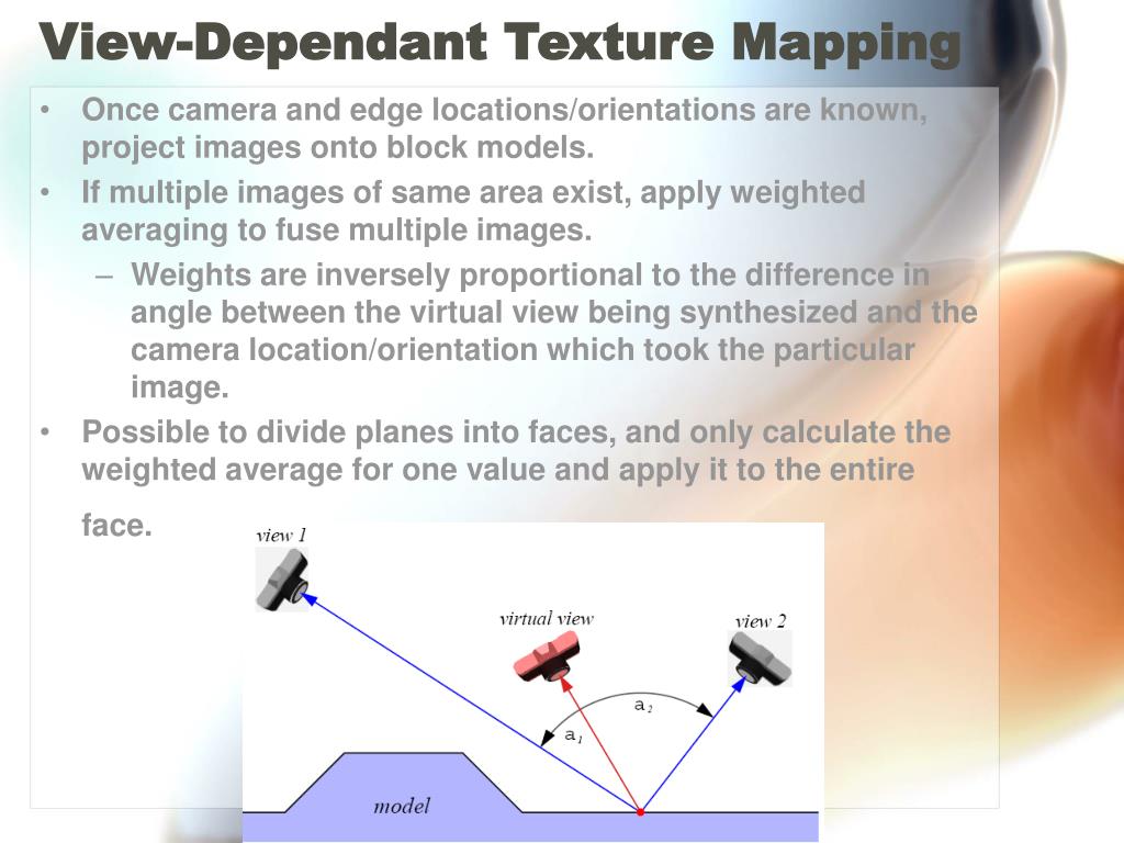 View-Dependant Texture Mapping • Once camera and edge locations/orientations are known, project images onto block models. • If multiple images of same area exist, apply weighted averaging to fuse multiple images. • Weights are inversely proportional to the difference in angle between the virtual view being synthesized and the camera location/orientation which took the particular image. • Possible to divide planes into faces, and only calculate the weighted average for one value and apply it to the entire face.