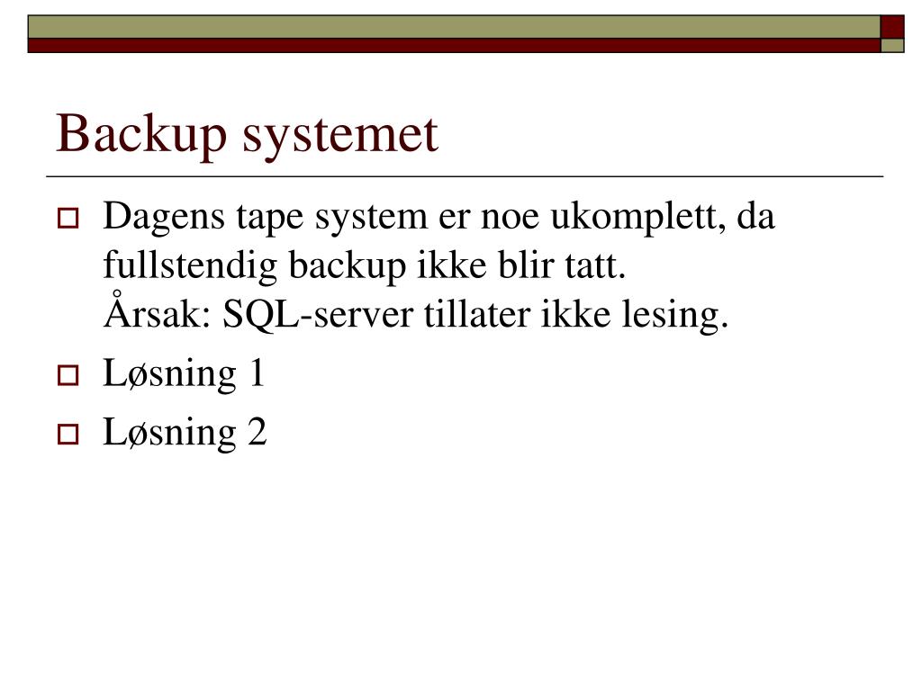 Backup systemet • Dagens tape system er noe ukomplett, da fullstendig backup ikke blir tatt. Årsak: SQL-server tillater ikke lesing. • Løsning 1 • Løsning 2