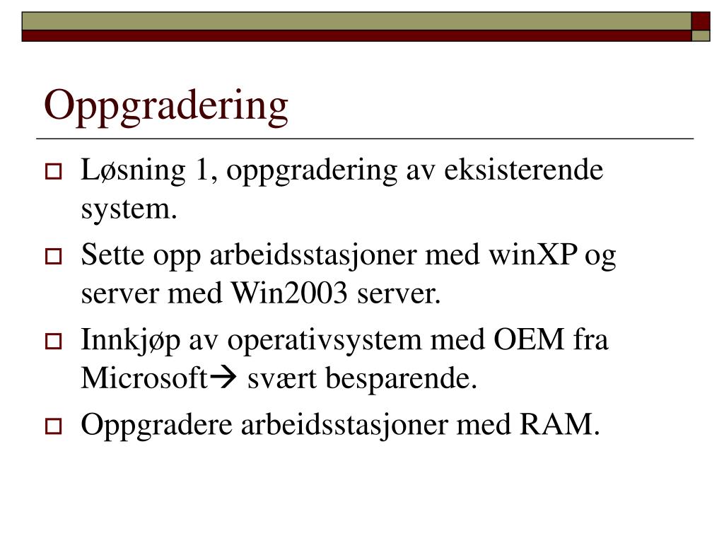 Oppgradering • Løsning 1, oppgradering av eksisterende system. • Sette opp arbeidsstasjoner med winXP og server med Win2003 server. • Innkjøp av operativsystem med OEM fra Microsoft svært besparende. • Oppgradere arbeidsstasjoner med RAM.