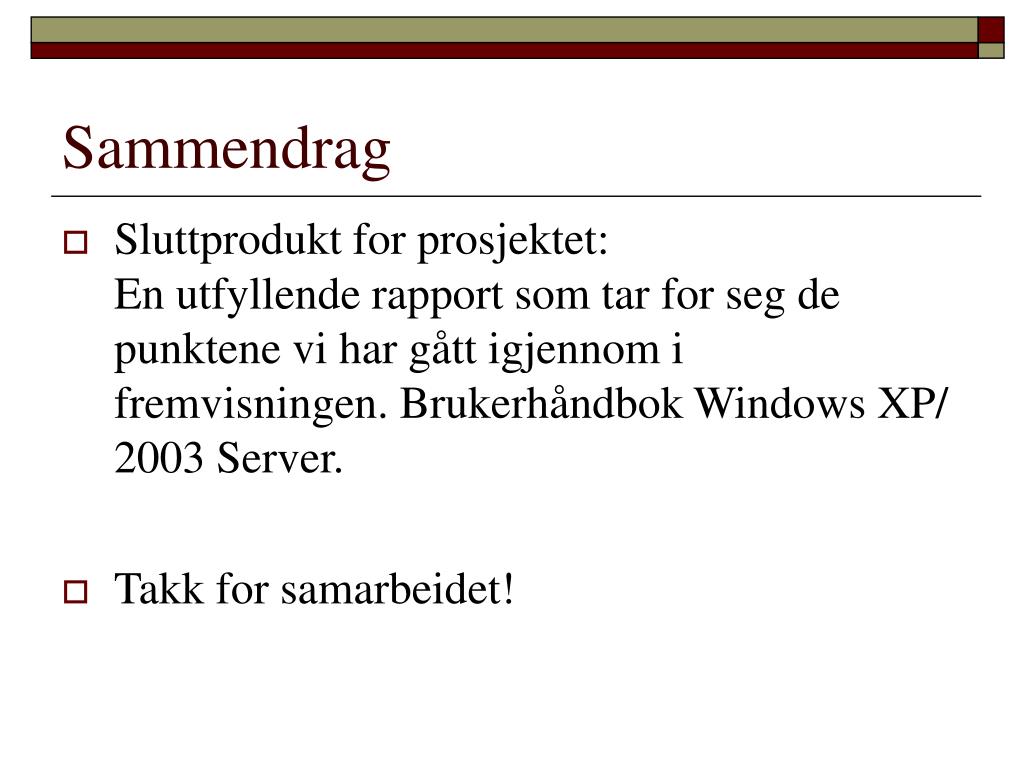 Sammendrag • Sluttprodukt for prosjektet:En utfyllende rapport som tar for seg de punktene vi har gått igjennom i fremvisningen. Brukerhåndbok Windows XP/ 2003 Server. • Takk for samarbeidet!