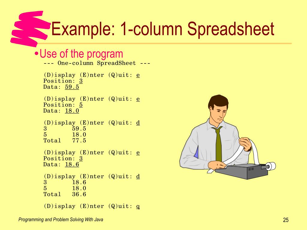 Example: 1-column Spreadsheet • Use of the program • --- One-column SpreadSheet --- • (D)isplay (E)nter (Q)uit: e • Position: 3 • Data: 59.5 • (D)isplay (E)nter (Q)uit: e • Position: 5 • Data: 18.0 • (D)isplay (E)nter (Q)uit: d • 3 59.5 • 5 18.0 • Total 77.5 • (D)isplay (E)nter (Q)uit: e • Position: 3 • Data: 18.6 • (D)isplay (E)nter (Q)uit: d • 3 18.6 • 5 18.0 • Total 36.6 • (D)isplay (E)nter (Q)uit: q Programming and Problem Solving With Java