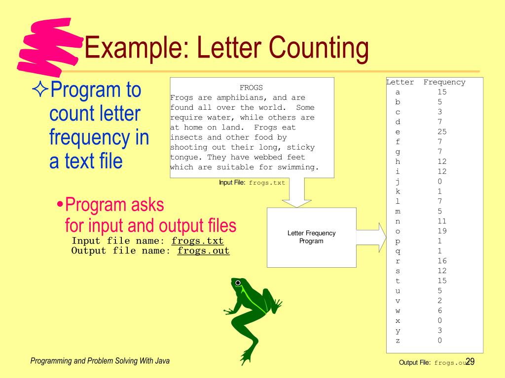 Example: Letter Counting • Program to count letter frequency in a text file • Program asks for input and output files • Input file name: frogs.txt • Output file name: frogs.out Programming and Problem Solving With Java