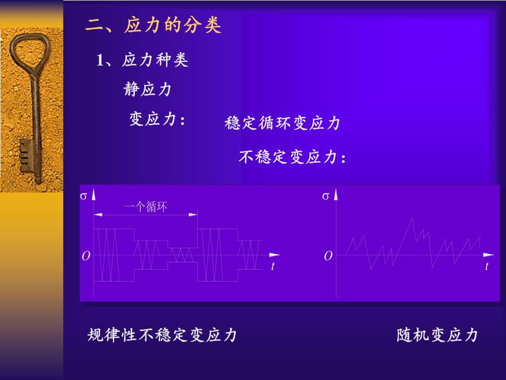 二、应力的分类 1、应力种类 静应力 变应力: 稳定循环变应力 不稳定变应力: 规律性不稳定变应力 随机变应力