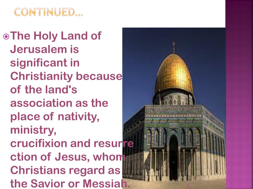 Continued… • The Holy Land of Jerusalem is significant in Christianity because of the land's association as the place of nativity, ministry, crucifixion and resurrection of Jesus, whom Christians regard as the Savior or Messiah.