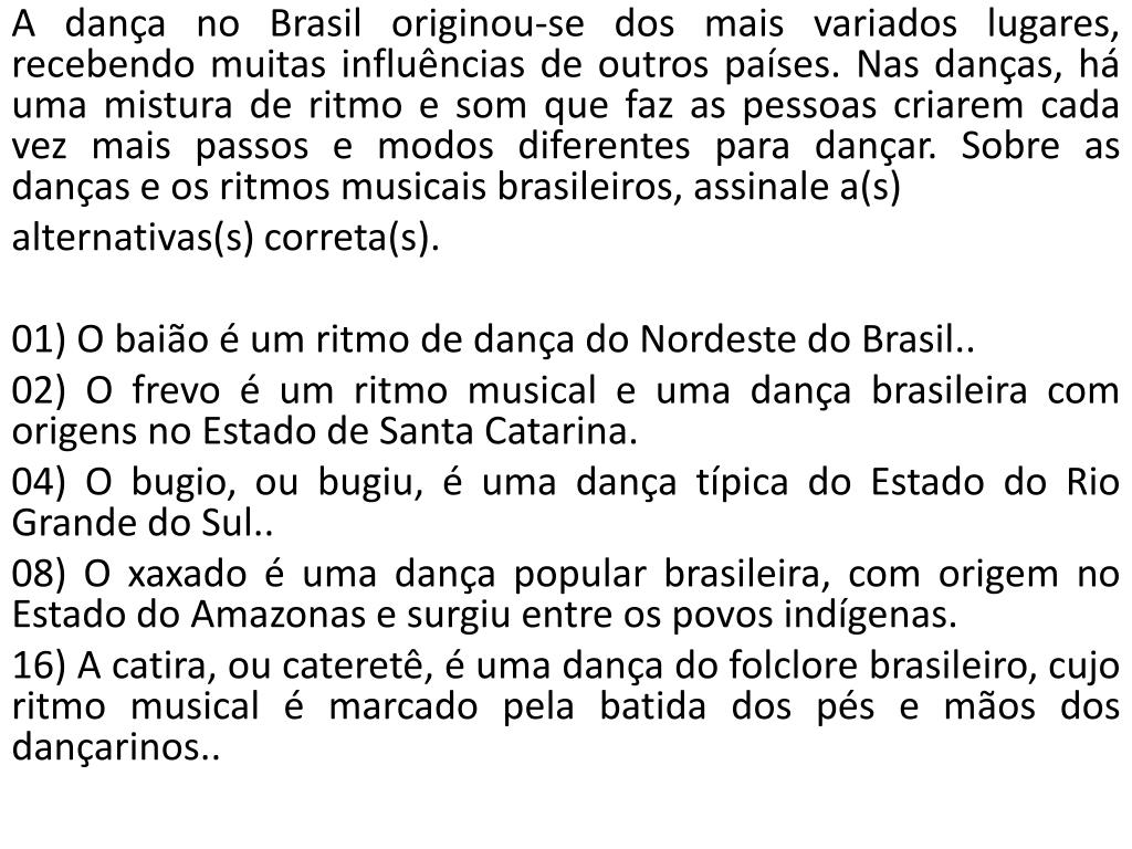 A dança no Brasil originou-se dos mais variados lugares, recebendo muitas influências de outros países. Nas danças, há uma mistura de ritmo e som que faz as pessoas criarem cada vez mais passos e modos diferentes para dançar. Sobre as danças e os ritmos musicais brasileiros, assinale a(s) alternativas(s) correta(s). 01) O baião é um ritmo de dança do Nordeste do Brasil.. 02) O frevo é um ritmo musical e uma dança brasileira com origens no Estado de Santa Catarina. 04) O bugio, ou bugiu, é uma dança típica do Estado do Rio Grande do Sul.. 08) O xaxado é uma dança popular brasileira, com origem no Estado do Amazonas e surgiu entre os povos indígenas. 16) A catira, ou cateretê, é uma dança do folclore brasileiro, cujo ritmo musical é marcado pela batida dos pés e mãos dos dançarinos..