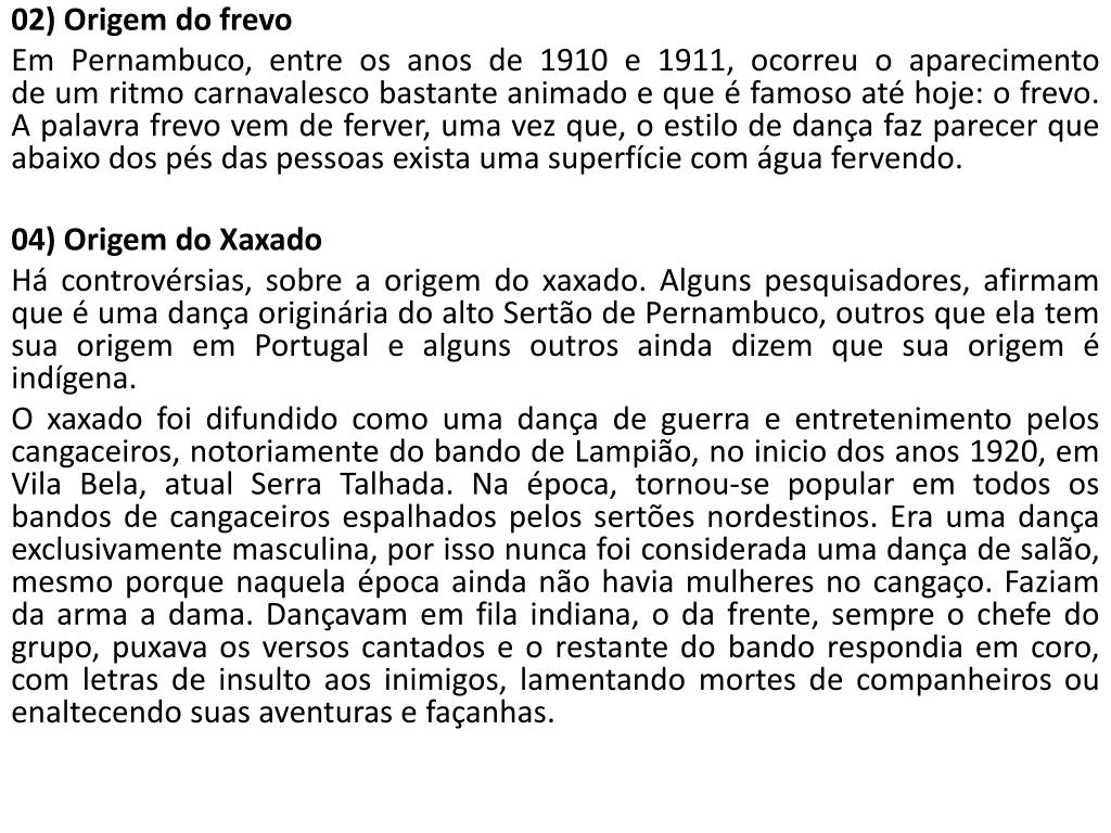 02) Origem do frevo Em Pernambuco, entre os anos de 1910 e 1911, ocorreu o aparecimento de um ritmo carnavalesco bastante animado e que é famoso até hoje: o frevo. A palavra frevo vem de ferver, uma vez que, o estilo de dança faz parecer que abaixo dos pés das pessoas exista uma superfície com água fervendo. 04) Origem do Xaxado Há controvérsias, sobre a origem do xaxado. Alguns pesquisadores, afirmam que é uma dança originária do alto Sertão de Pernambuco, outros que ela tem sua origem em Portugal e alguns outros ainda dizem que sua origem é indígena. O xaxado foi difundido como uma dança de guerra e entretenimento pelos cangaceiros, notoriamente do bando de Lampião, no inicio dos anos 1920, em Vila Bela, atual Serra Talhada. Na época, tornou-se popular em todos os bandos de cangaceiros espalhados pelos sertões nordestinos. Era uma dança exclusivamente masculina, por isso nunca foi considerada uma dança de salão, mesmo porque naquela época ainda não havia mulheres no cangaço. Faziam da arma a dama. Dançavam em fila indiana, o da frente, sempre o chefe do grupo, puxava os versos cantados e o restante do bando respondia em coro, com letras de insulto aos inimigos, lamentando mortes de companheiros ou enaltecendo suas aventuras e façanhas.