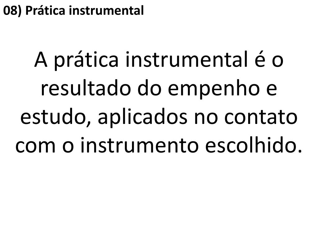 08)Prática instrumental A prática instrumental é o resultado do empenho e estudo, aplicados no contato com o instrumento escolhido.