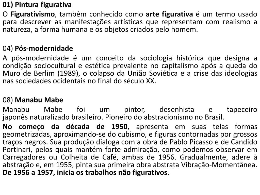 01) Pintura figurativa O Figurativismo, também conhecido como arte figurativa é um termo usado para descrever as manifestações artísticas que representam com realismo a natureza, a forma humana e os objetos criados pelo homem. 04) Pós-modernidade A pós-modernidade é um conceito da sociologia histórica que designa a condição sociocultural eestéticaprevalente no capitalismo após a queda do Muro de Berlim (1989), o colapso da União Soviética e a crise das ideologias nas sociedades ocidentais no final do século XX. 08) Manabu Mabe Manabu Mabefoi um pintor, desenhista e tapeceiro japonês naturalizado brasileiro. Pioneiro do abstracionismo no Brasil. No começo da década de 1950, apresenta em suas telas formas geometrizadas, aproximando-se do cubismo, e figuras contornadas por grossos traços negros. Sua produção dialoga com a obra de Pablo Picasso e de Candido Portinari, pelos quais mantém forte admiração, como podemos observar em Carregadores ou Colheita de Café, ambas de 1956. Gradualmente, adere à abstração e, em 1955, pinta sua primeira obra abstrata Vibração-Momentânea. De 1956 a 1957, inicia os trabalhos não figurativos.