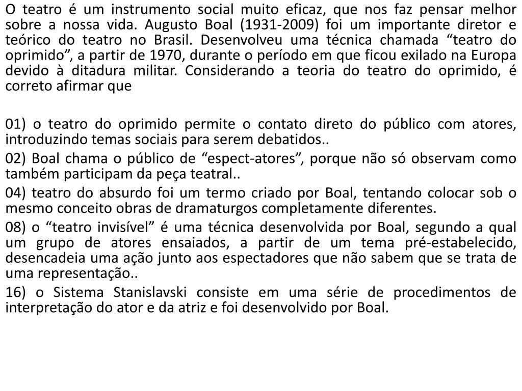 O teatro é um instrumento social muito eficaz, que nos faz pensar melhor sobre a nossa vida. Augusto Boal (1931-2009) foi um importante diretor e teórico do teatro no Brasil. Desenvolveu uma técnica chamada “teatro do oprimido”, a partir de 1970, durante o período em que ficou exilado na Europa devido à ditadura militar. Considerando a teoria do teatro do oprimido, é correto afirmar que 01) o teatro do oprimido permite o contato direto do público com atores, introduzindo temas sociais para serem debatidos.. 02) Boal chama o público de “espect-atores”, porque não só observam como também participam da peça teatral.. 04) teatro do absurdo foi um termo criado por Boal, tentando colocar sob o mesmo conceito obras de dramaturgos completamente diferentes. 08) o “teatro invisível” é uma técnica desenvolvida por Boal, segundo a qual um grupo de atores ensaiados, a partir de um tema pré-estabelecido, desencadeia uma ação junto aos espectadores que não sabem que se trata de uma representação.. 16) o Sistema Stanislavski consiste em uma série de procedimentos de interpretação do ator e da atriz e foi desenvolvido por Boal.