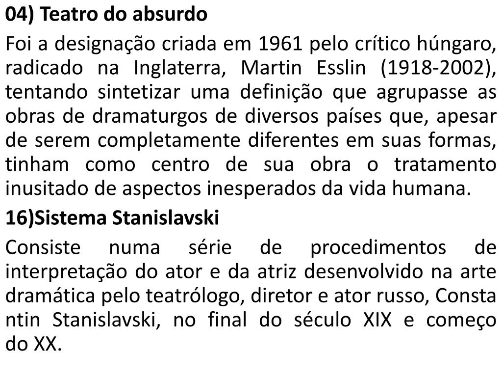 04) Teatro do absurdo Foi a designação criada em 1961 pelo crítico húngaro, radicado na Inglaterra, Martin Esslin (1918-2002), tentando sintetizar uma definição que agrupasse as obras de dramaturgos de diversos países que, apesar de serem completamente diferentes em suas formas, tinham como centro de sua obra o tratamento inusitado de aspectos inesperados da vida humana. 16)Sistema Stanislavski Consiste numa série de procedimentos de interpretação do ator e da atriz desenvolvido na arte dramática pelo teatrólogo, diretor e ator russo, ConstantinStanislavski, no final do século XIX e começo do XX.