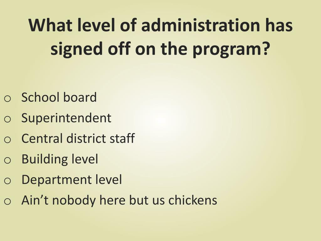 What level of administration has signed off on the program? • School board • Superintendent • Central district staff • Building level • Department level • Ain’t nobody here but us chickens