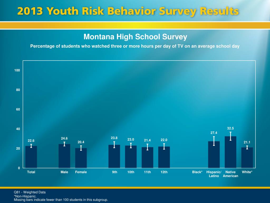 Montana High School Survey Percentage of students who watched three or more hours per day of TV on an average school day Q81 - Weighted Data *Non-Hispanic. Missing bars indicate fewer than 100 students in this subgroup.