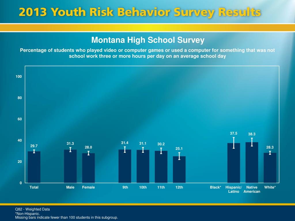 Montana High School Survey Percentage of students who played video or computer games or used a computer for something that was not school work three or more hours per day on an average school day Q82 - Weighted Data *Non-Hispanic. Missing bars indicate fewer than 100 students in this subgroup.