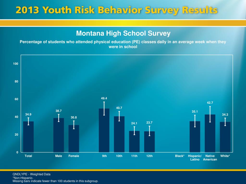 Montana High School Survey Percentage of students who attended physical education (PE) classes daily in an average week when they were in school QNDLYPE - Weighted Data *Non-Hispanic. Missing bars indicate fewer than 100 students in this subgroup.