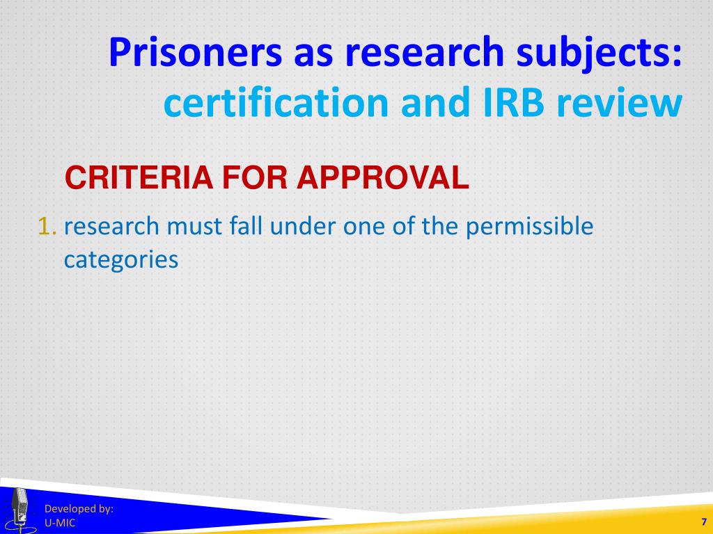 Prisoners as research subjects: certification and IRB review CRITERIA FOR APPROVAL research must fall under one of the permissible categories Developed by: U-MIC