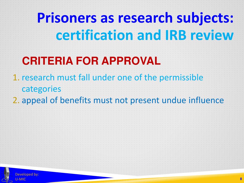 Prisoners as research subjects: certification and IRB review CRITERIA FOR APPROVAL research must fall under one of the permissible categories appeal of benefits must not present undue influence Developed by: U-MIC