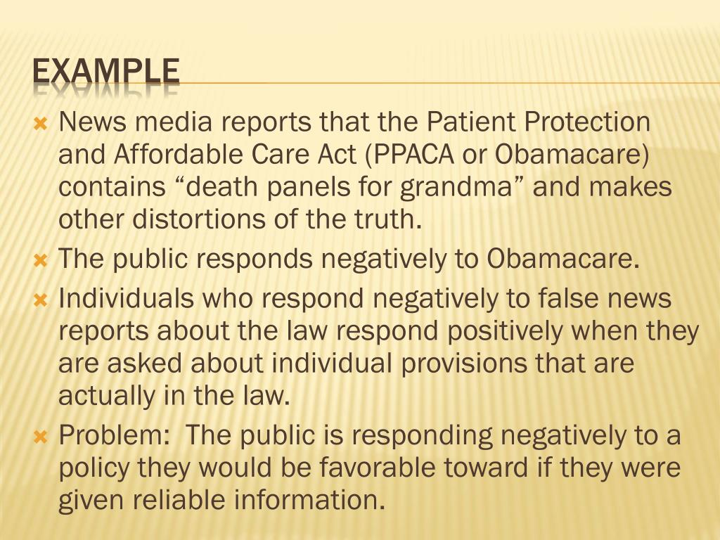News media reports that the Patient Protection and Affordable Care Act (PPACA or Obamacare) contains “death panels for grandma” and makes other distortions of the truth. The public responds negatively to Obamacare. Individuals who respond negatively to false news reports about the law respond positively when they are asked about individual provisions that are actually in the law. Problem: The public is responding negatively to a policy they would be favorable toward if they were given reliable information. Example