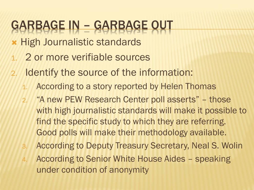 High Journalistic standards • 2 or more verifiable sources • Identify the source of the information: • According to a story reported by Helen Thomas • “A new PEW Research Center poll asserts” – those with high journalistic standards will make it possible to find the specific study to which they are referring. Good polls will make their methodology available. • According to Deputy Treasury Secretary, Neal S. Wolin • According to Senior White House Aides – speaking under condition of anonymity Garbage in – garbage out
