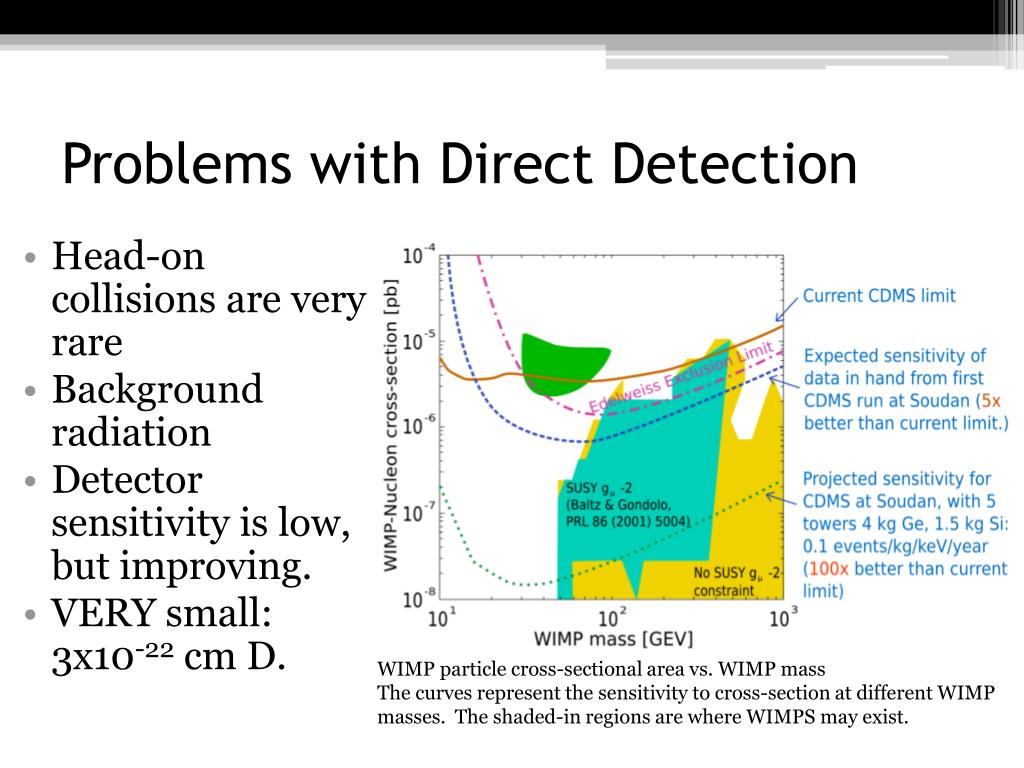 Problems with Direct Detection • Head-on collisions are very rare • Background radiation • Detector sensitivity is low, but improving. • VERY small: 3x10-22 cm D. WIMP particle cross-sectional area vs. WIMP mass The curves represent the sensitivity to cross-section at different WIMP masses. The shaded-in regions are where WIMPS may exist.