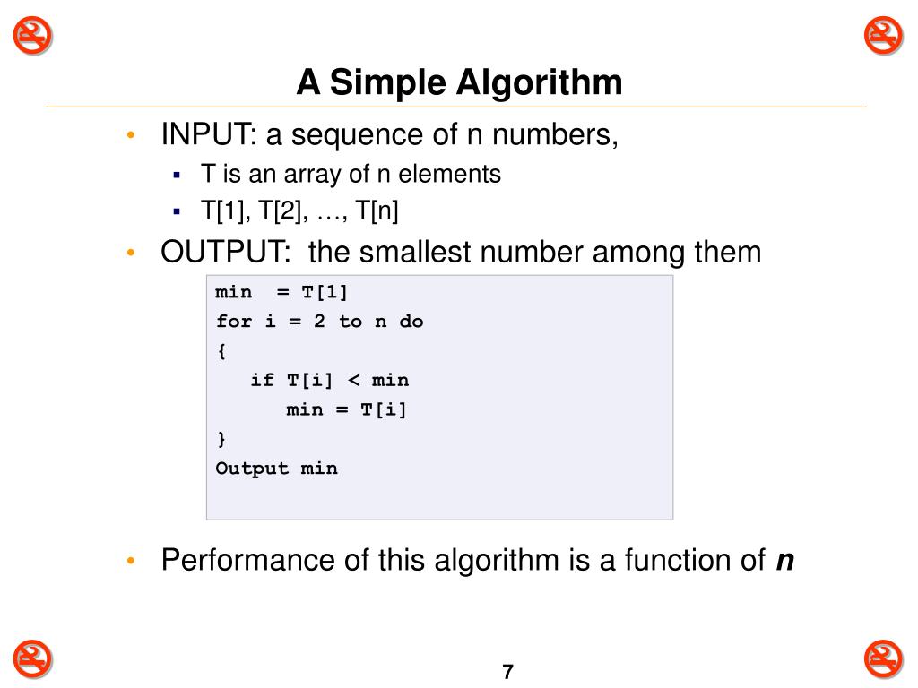 A Simple Algorithm • INPUT: a sequence of n numbers, • T is an array of n elements • T[1], T[2], …, T[n] • OUTPUT: the smallest number among them • Performance of this algorithm is a function of n min = T[1] for i = 2 to n do { if T[i] < min min =T[i] } Output min