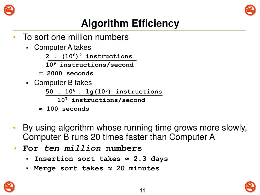 Algorithm Efficiency • To sort one million numbers • Computer A takes 2 . (106)2 instructions 109 instructions/second = 2000 seconds • Computer B takes 50 . 106 . lg(106) instructions 107 instructions/second 100 seconds • By using algorithm whose running time grows more slowly, Computer B runs 20 times faster than Computer A • For ten million numbers • Insertion sort takes 2.3 days • Merge sort takes 20 minutes