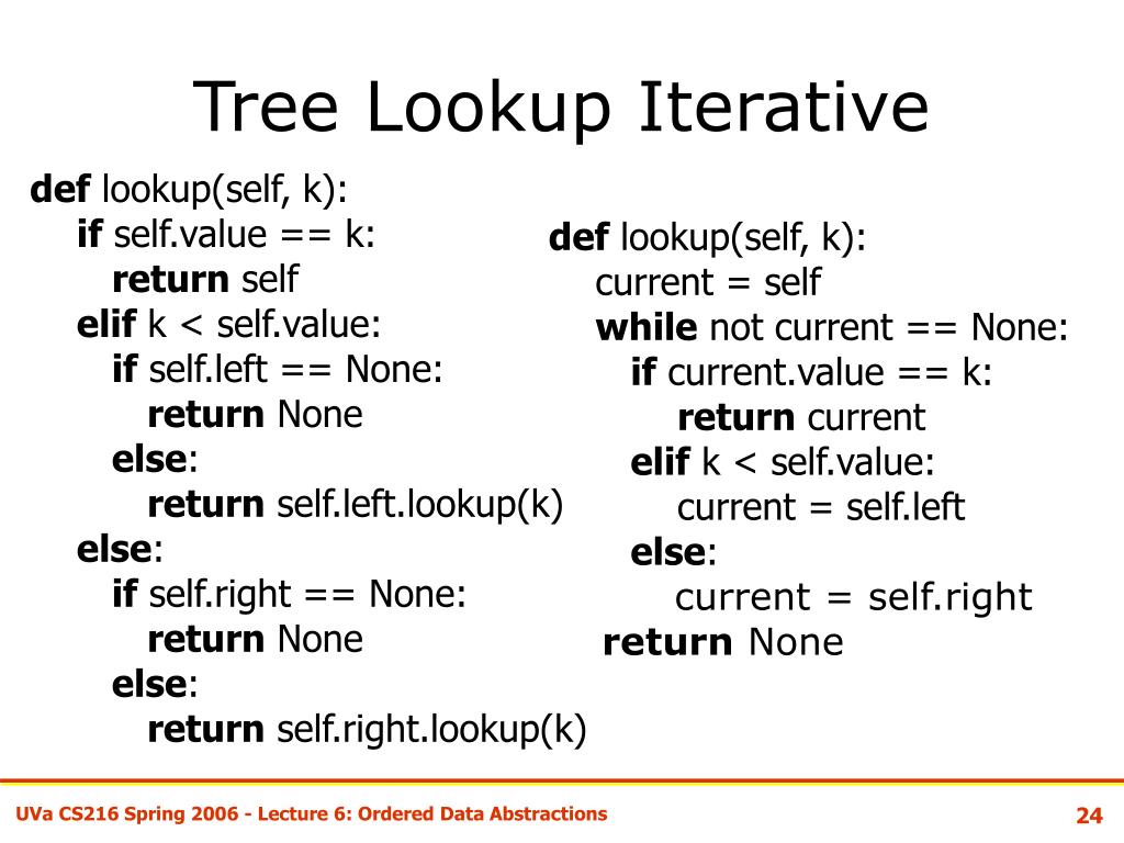 Tree Lookup Iterative def lookup(self, k): if self.value == k: return self elif k < self.value: if self.left == None: return None else: return self.left.lookup(k) else: if self.right == None: return None else: return self.right.lookup(k) def lookup(self, k): current = self while not current == None: if current.value == k: return current elif k < self.value: current = self.left else: current = self.right return None