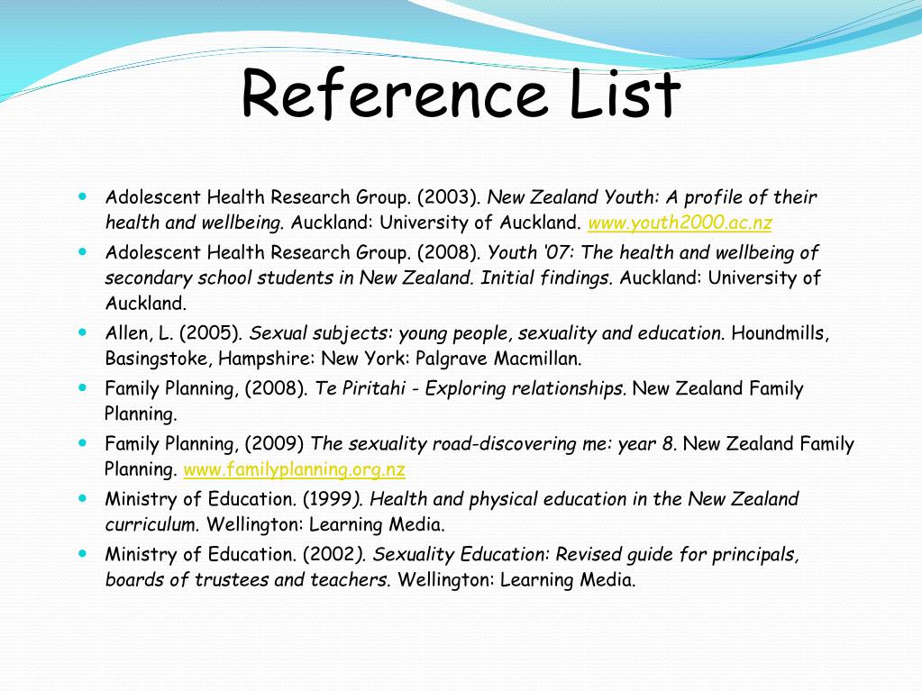 Reference List • Adolescent Health Research Group. (2003). New Zealand Youth: A profile of their health and wellbeing. Auckland: University of Auckland. www.youth2000.ac.nz • Adolescent Health Research Group. (2008). Youth ‘07: The health and wellbeing of secondary school students in New Zealand. Initial findings. Auckland: University of Auckland. • Allen, L. (2005). Sexual subjects: young people, sexuality and education. Houndmills, Basingstoke, Hampshire: New York: Palgrave Macmillan. • Family Planning, (2008). Te Piritahi - Exploring relationships. New Zealand Family Planning. • Family Planning, (2009) The sexuality road-discovering me: year 8. New Zealand Family Planning. www.familyplanning.org.nz • Ministry of Education. (1999). Health and physical education in the New Zealand curriculum. Wellington: Learning Media. • Ministry of Education. (2002). Sexuality Education: Revised guide for principals, boards of trustees and teachers. Wellington: Learning Media.
