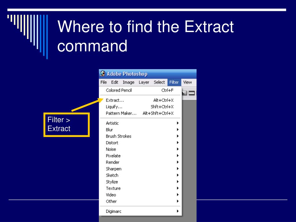 The Extract Command • Provides a sophisticated way to isolate a foreground object from its background • Objects with wispy, intricate or indefinable edges can be clipped from their background with a minimum amount of work