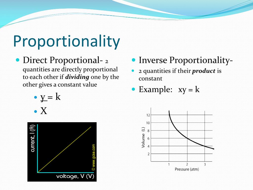 Proportionality • Direct Proportional- 2 quantities are directly proportional to each other if dividing one by the other gives a constant value • y = k • X • Inverse Proportionality- • 2 quantities if their product is constant • Example: xy = k