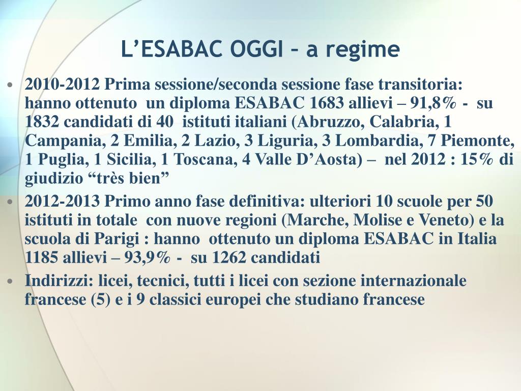 L’ESABAC OGGI – a regime • 2010-2012 Prima sessione/seconda sessione fase transitoria: hanno ottenuto un diploma ESABAC 1683 allievi – 91,8% - su 1832 candidati di 40 istituti italiani (Abruzzo, Calabria, 1 Campania, 2 Emilia, 2 Lazio, 3 Liguria, 3 Lombardia, 7 Piemonte, 1 Puglia, 1 Sicilia, 1 Toscana, 4 Valle D’Aosta) – nel 2012 : 15% di giudizio “très bien” • 2012-2013 Primo anno fase definitiva: ulteriori 10 scuole per 50 istituti in totale con nuove regioni (Marche, Molise e Veneto) e la scuola di Parigi : hanno ottenuto un diploma ESABAC in Italia 1185 allievi – 93,9% - su 1262 candidati • Indirizzi: licei, tecnici, tutti i licei con sezione internazionale francese (5) e i 9 classici europei che studiano francese