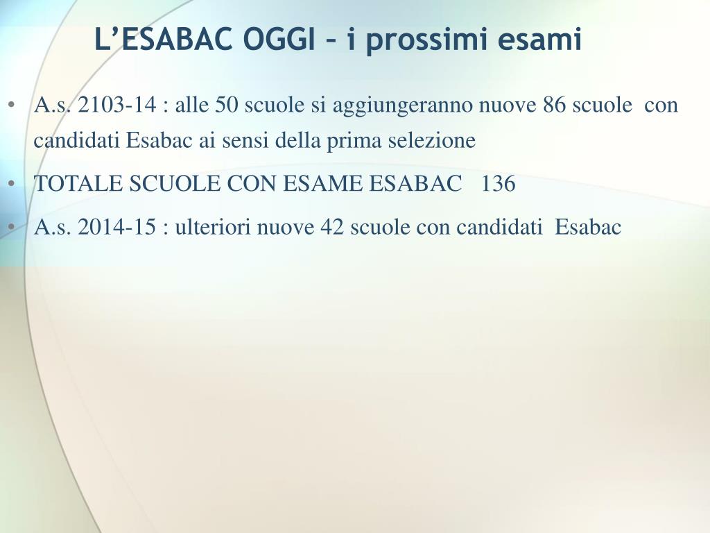 L’ESABAC OGGI – i prossimi esami • A.s. 2103-14 : alle 50 scuole si aggiungeranno nuove 86 scuole con candidati Esabac ai sensi della prima selezione • TOTALE SCUOLE CON ESAME ESABAC 136 • A.s. 2014-15 : ulteriori nuove 42 scuole con candidati Esabac