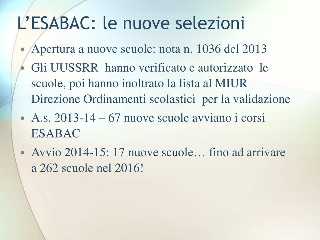 L’ESABAC: le nuove selezioni • Apertura a nuove scuole: nota n. 1036 del 2013 • Gli UUSSRR hanno verificato e autorizzato le scuole, poi hanno inoltrato la lista al MIUR Direzione Ordinamenti scolastici per la validazione • A.s. 2013-14 – 67 nuove scuole avviano i corsi ESABAC • Avvio 2014-15: 17 nuove scuole… fino ad arrivare a 262 scuole nel 2016!