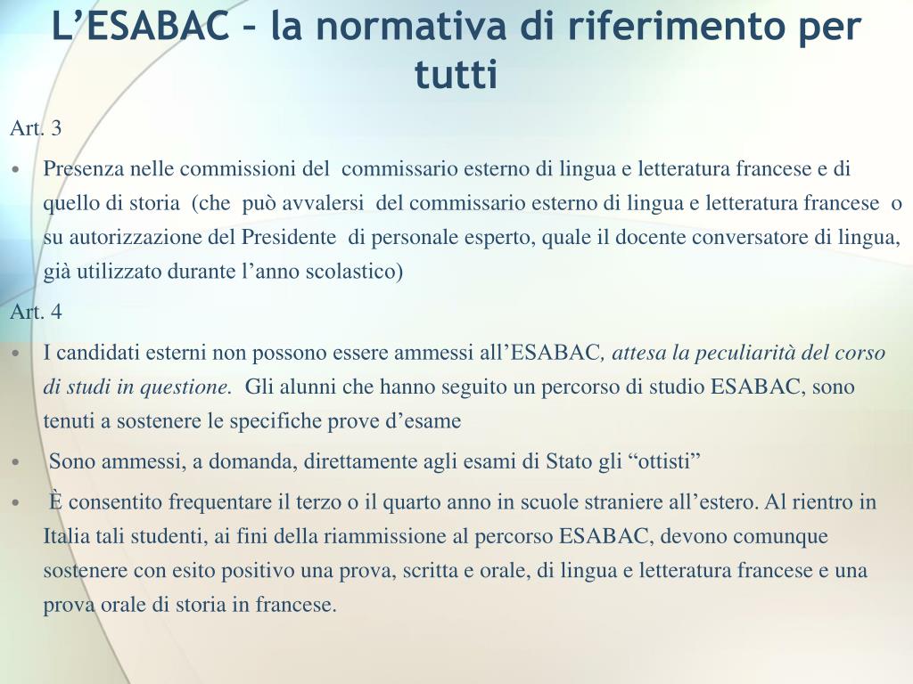 L’ESABAC – la normativa di riferimento per tutti Art. 3 • Presenza nelle commissioni del commissario esterno di lingua e letteratura francese e di quello di storia (che può avvalersi del commissario esterno di lingua e letteratura francese o su autorizzazione del Presidente di personale esperto, quale il docente conversatore di lingua, già utilizzato durante l’anno scolastico) Art. 4 • I candidati esterni non possono essere ammessi all’ESABAC, attesa la peculiarità del corso di studi in questione. Gli alunni che hanno seguito un percorso di studio ESABAC, sono tenuti a sostenere le specifiche prove d’esame • Sono ammessi, a domanda, direttamente agli esami di Stato gli “ottisti” • È consentito frequentare il terzo o il quarto anno in scuole straniere all’estero. Al rientro in Italia tali studenti, ai fini della riammissione al percorso ESABAC, devono comunque sostenere con esito positivo una prova, scritta e orale, di lingua e letteratura francese e una prova orale di storia in francese.
