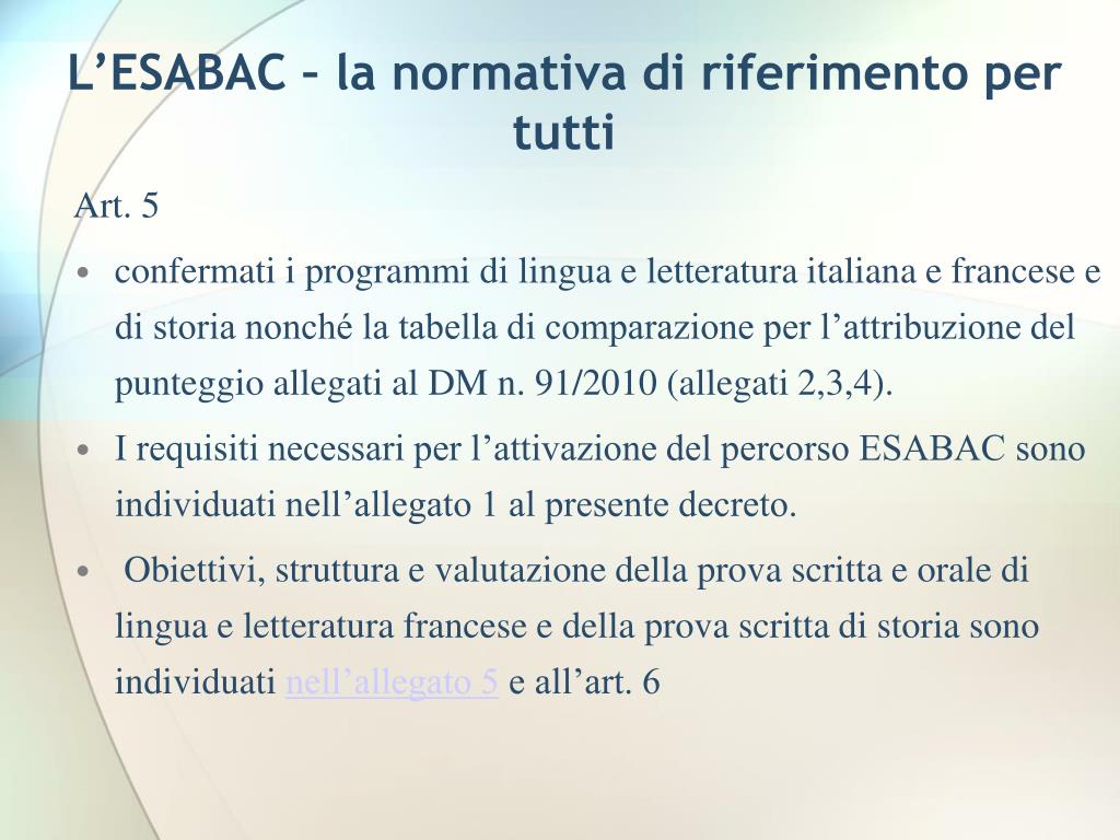 L’ESABAC – la normativa di riferimento per tutti Art. 5 • confermati i programmi di lingua e letteratura italiana e francese e di storia nonché la tabella di comparazione per l’attribuzione del punteggio allegati al DM n. 91/2010 (allegati 2,3,4). • I requisiti necessari per l’attivazione del percorso ESABAC sono individuati nell’allegato 1 al presente decreto. • Obiettivi, struttura e valutazione della prova scritta e orale di lingua e letteratura francese e della prova scritta di storia sono individuati nell’allegato 5 e all’art. 6