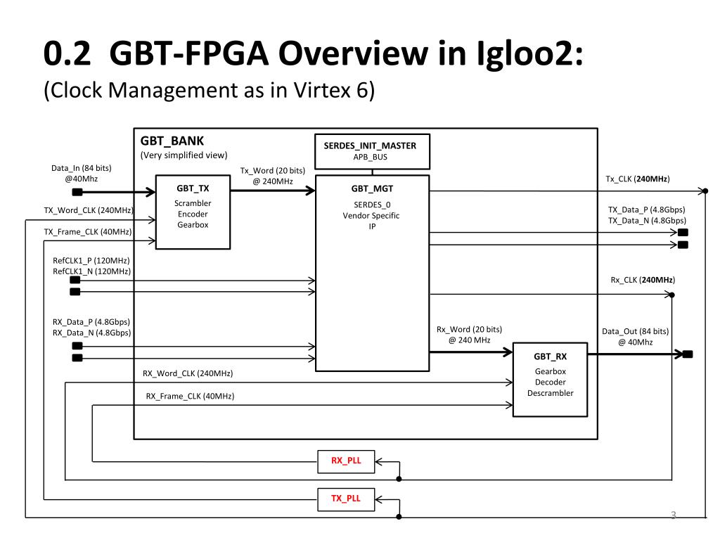 0.2 GBT-FPGA Overview in Igloo2:(Clock Management as in Virtex 6) GBT_BANK (Very simplified view) SERDES_INIT_MASTER APB_BUS Data_In (84 bits) @40Mhz Tx_Word (20 bits) @ 240MHz Tx_CLK (240MHz) GBT_TX Scrambler Encoder Gearbox GBT_MGT SERDES_0 Vendor Specific IP TX_Data_P (4.8Gbps) TX_Data_N (4.8Gbps) TX_Word_CLK (240MHz) TX_Frame_CLK (40MHz) RefCLK1_P (120MHz) RefCLK1_N (120MHz) Rx_CLK (240MHz) RX_Data_P (4.8Gbps) RX_Data_N (4.8Gbps) Rx_Word (20 bits) @ 240 MHz Data_Out (84 bits) @ 40Mhz GBT_RX Gearbox Decoder Descrambler RX_Word_CLK (240MHz) RX_Frame_CLK (40MHz) RX_PLL TX_PLL