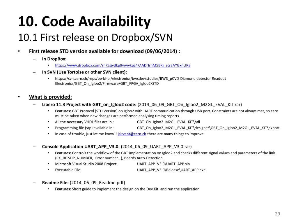10. Code Availability10.1 First release on Dropbox/SVN • First release STD version available for download (09/06/2014) : • In DropBox: • https://www.dropbox.com/sh/5sjvdkp9wwykpz4/AADrIrhM5BKj_zcraAYGxnURa • In SVN (Use Tortoise or other SVN client): • https://svn.cern.ch/reps/be-bi-bl/electronics/bwsdev/studies/BWS_pCVD Diamond detector Readout Electronics/GBT_On_Igloo2/Firmware/GBT_FPGA_Igloo2/STD • What is provided: • Libero 11.3 Project with GBT_on_Igloo2 code: (2014_06_09_GBT_On_Igloo2_M2GL_EVAL_KIT.rar) • Features: GBT Protocol (STD Version) on Igloo2 with UART communication through USB port. Constraints are not always met, so care must be taken when new changes are performed analysing timing reports. • All the necessary VHDL files are in : GBT_On_Igloo2_M2GL_EVAL_KIT\hdl • Programming file (stp) available in : GBT_On_Igloo2_M2GL_EVAL_KIT\designer\GBT_On_Igloo2_M2GL_EVAL_KIT\export • In case of trouble, just let me know!! jsirvent@cern.ch there are many things to improve. • Console Application UART_APP_V3.0: (2014_06_09_UART_APP_V3.0.rar) • Features: Controls the workflow of the GBT implementation on Igloo2 and checks different signal values and parameters of the link (RX_BITSLIP_NUMBER, Error number…), Boards Auto-Detection. • Microsoft Visual Studio 2008 Project: UART_APP_V3.0\UART_APP.sln • Executable File: UART_APP_V3.0\Release\UART_APP.exe • Readme File: (2014_06_09_Readme.pdf) • Features: Short guide to implement the design on the Dev.Kit and run the application