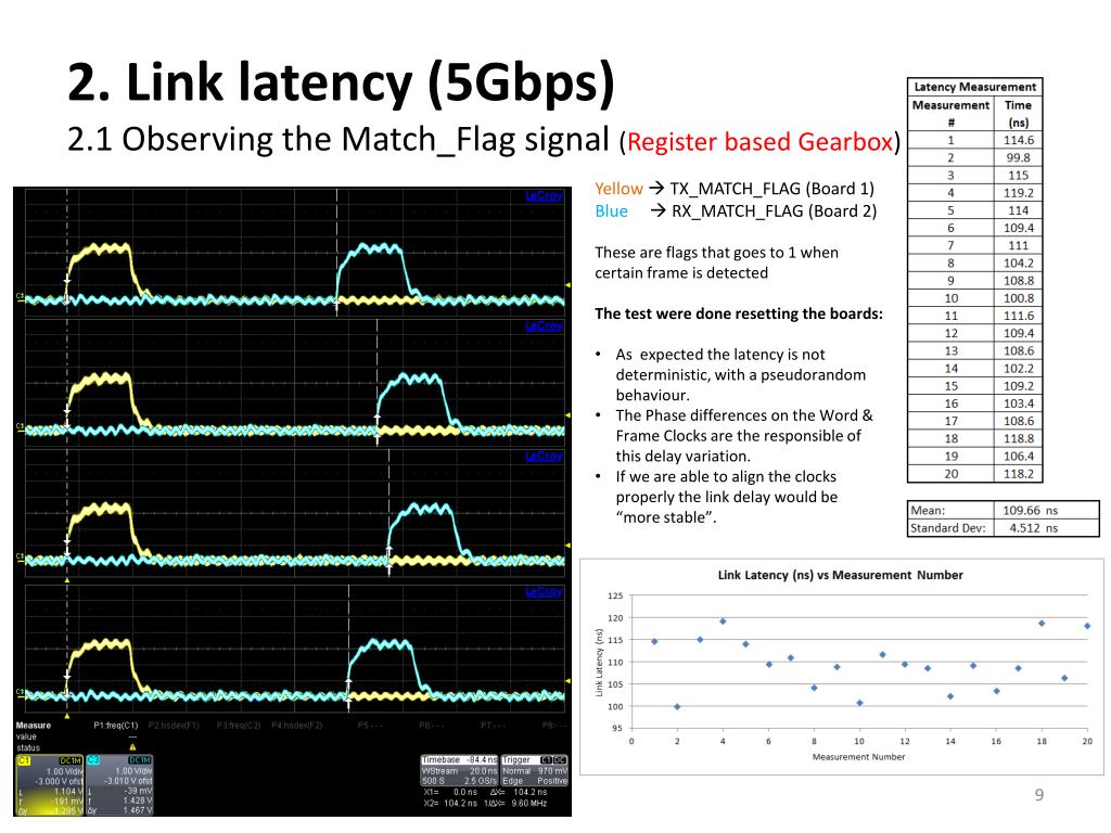 2. Link latency (5Gbps)2.1 Observing the Match_Flag signal (Memory based Gearbox) • Yellow TX_MATCH_FLAG (Board 1) • Blue RX_MATCH_FLAG (Board 2) • These are flags that goes to 1 when certain frame is detected • The test were done resetting the boards: • As expected the latency is not deterministic, with a pseudorandom behaviour. • The Phase differences on the Word & Frame Clocks are the responsible of this delay variation. • If we are able to align the clocks properly the link delay would be “more stable”.